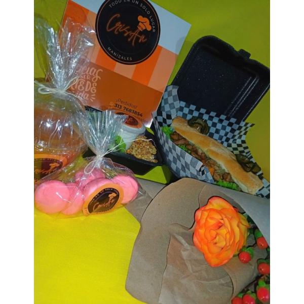 CrisAn, bocados para toda hora del día llenos de amor y sabor natura, con opción de cocina tradicional, gourmet y saludable para llevar sentimientos a través de los alimentos. Tu Pakc'CrisAn lleva: *Alimentos y bebida 1 Opción preparación de sal 1 Opción preparación con fruta 1 Opción preparación dulce 1 Opción de Snack 1 bebida (Mix de frutos, batido ó cóctel sin licor) *Empaque y decoración: 1 bolsa kraf agarradera 1 Tarjeta en opalina 1 Arreglo flor