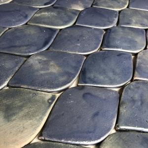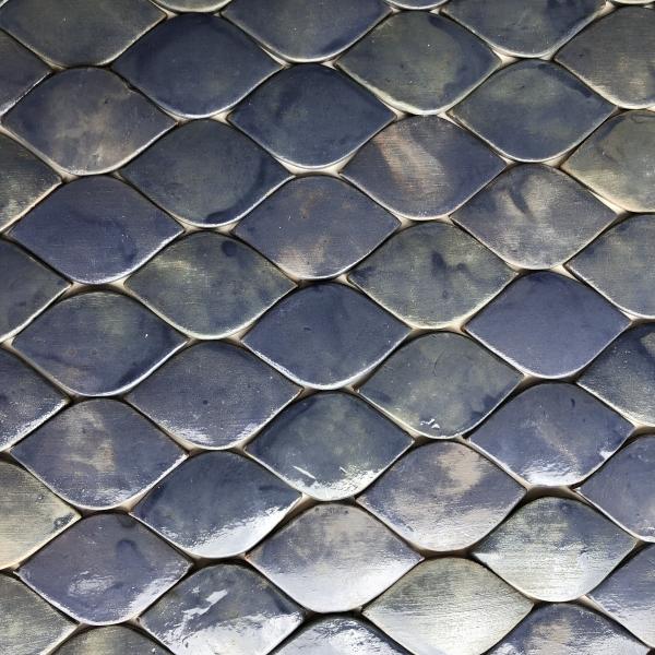 Este cerámico está inspirado en las formas orgánicas de la naturaleza con acabado en esmalte azul, transparente o blanco. Son piezas de 6x5 cms y se venden por metro cuadrado.