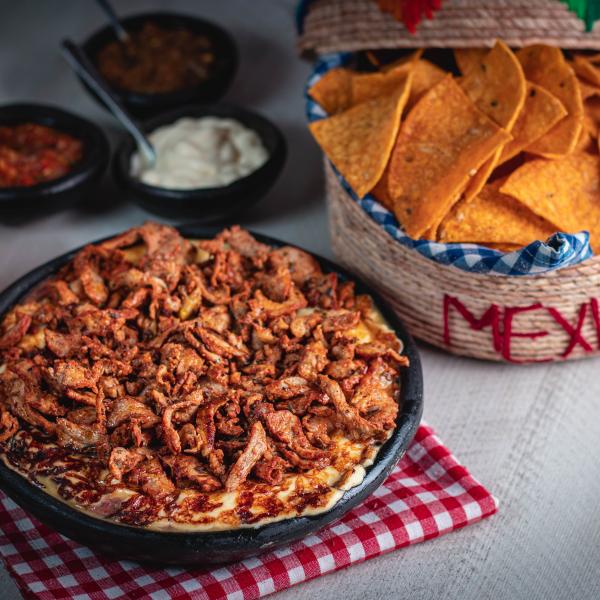 Salsa de frijoles estilo mexicano, con queso gratinado, pastor y canasta de nachos.