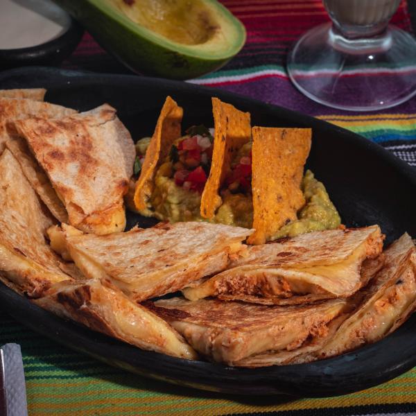 Tortilla de harina con queso, servido con guacamole, pico de gallo y nachos. Proteína (Pastor, Tinga, Vegetales, Deshebrada)