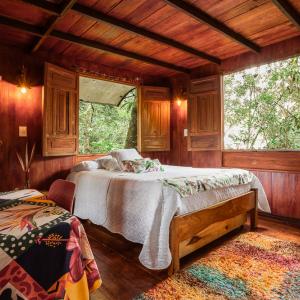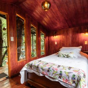 Es una estructura con una elevación de 11 m que le confiere una panorámica muy especial hacia los doseles de los árboles, ya que se encuentra inmersa en un espeso bosque. Tres hermosos árboles se integran armónicamente a la casa. Cuenta con dos habitaciones tipo estándar, una ducha de concepto abierto, un balcón y una terraza, desde los cuales se aprecia la exuberancia de la naturaleza y se percibe el hermoso sonido de la quebrada Tarifa por pareja: $420.000 CAPACIDAD DE LA CASA 3 PERSONAS