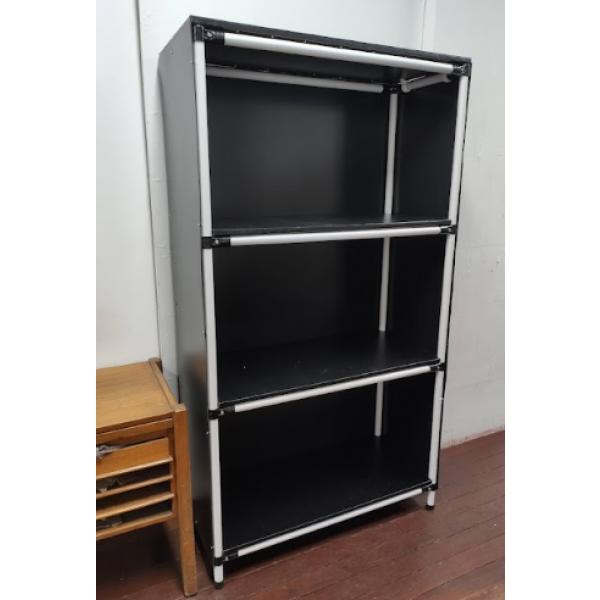 Almacenamiento en 3 niveles con superficies en madera aglomerada recubierta de lona negra; paredes en lámina plástica. Tapones de caucho en las bases. Ancho 92cm / profundidad 40cm / altura 170cm. Capacidad: 50Kg por nivel.
