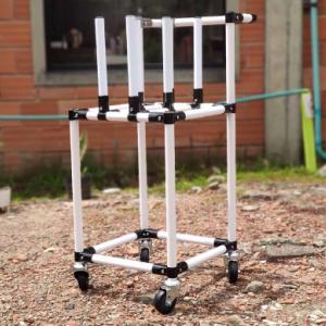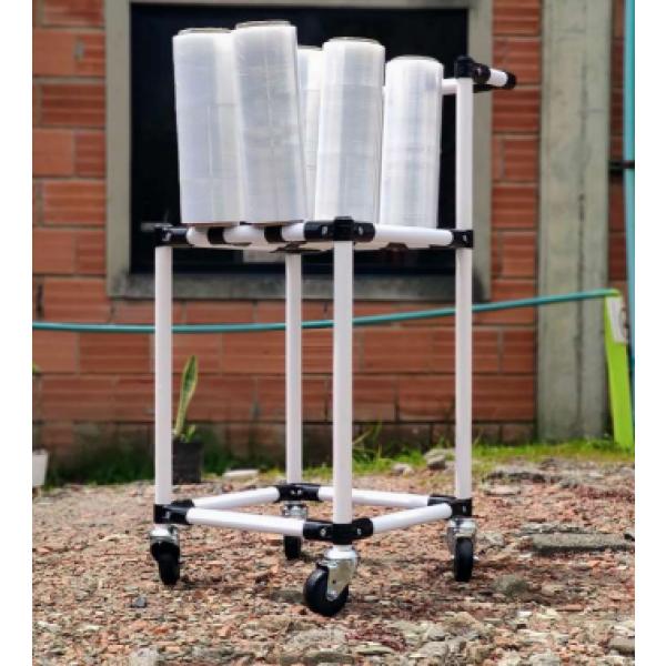 Transporte y almacenamiento de rollos de plástico (vinipel). Cuenta con ruedas de 3" para diferentes tipos de pisos. Ancho 40cm / profundidad 40cm / altura 90cm. Capacidad: de 6 rollos.