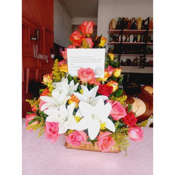 Este hermoso arreglo combina colores y formas que evocan la belleza y el encanto de lo clásico. Perfecto para cualquier ocasión que merece un toque de sofisticación y estilo. Incluye tarjeta domicilio