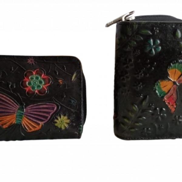 - Hecha con cuero genuino de alta calidad - Diseño de mariposas exclusivo y elegante - 2 cremalleras para separar tarjetas y efectivo - Medidas: 12 cm x 10 cm - Ideal para llevar tarjetas de crédito, débito, efectivo y documentos personales