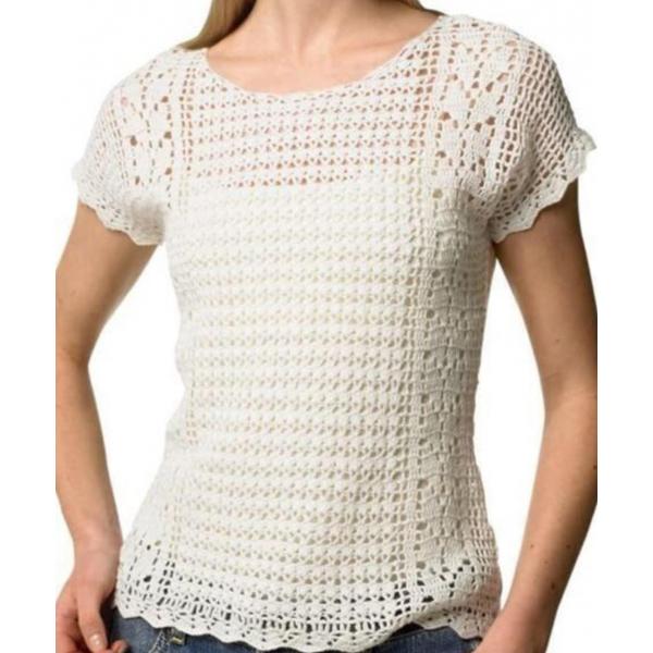 Blusa de manga corta con un detallado patrón de crochet y perforaciones. Ideal para un look casual o elegante, esta prenda ofrece un diseño atractivo y transpirable. Perfecta para combinar con jeans o faldas.