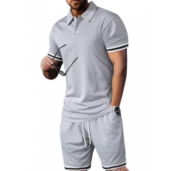 ¡Luce relajado y con estilo! Este conjunto incluye una camiseta polo gris con detalles en blanco en el cuello y las mangas, combinada con shorts a juego con cintura ajustable. Completa tu look con gafas de sol negras y un reloj elegante. Perfecto para un día casual o una salida deportiva. ¡No te lo pierdas