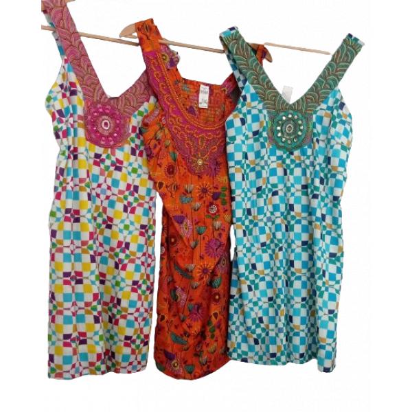 ¡Luce espectacular con estos vestidos vibrantes! El vestido a cuadros multicolor con detalles rosados, el vestido naranja con patrones de flores y pavos reales, y el vestido a cuadros azul y blanco con acentos verdes son perfectos para cualquier ocasión. Con sus diseños únicos y colores llamativos, estos vestidos te harán destacar. ¡Añade un toque de alegría y estilo a tu guardarropa con estas piezas únicas!