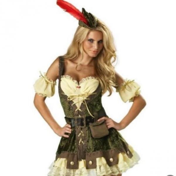 Disfraz de Robin Hood para mujer, audaz y encantador. Este conjunto incluye un vestido con detalles medievales y accesorios que te harán destacar en cualquier fiesta temática o evento de disfraces. El precio varía de acuerdo a las necesidades del cliente.
