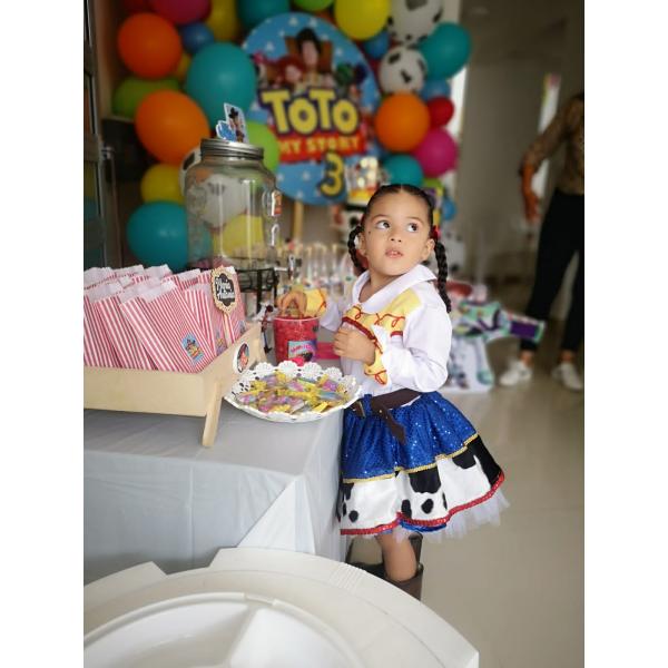 Disfraz de Jessie para niña, alegre y lleno de energía. Este conjunto incluye un vestido colorido con detalles vaqueros, perfecto para que tu pequeña brille como la famosa vaquera de Toy Story en cualquier celebración. El precio varía de acuerdo a los requerimientos del cliente.