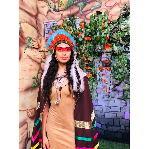 Disfraz de india, vibrante y auténtico. Este conjunto incluye un vestido con detalles tradicionales y accesorios que evocan la cultura indígena, perfecto para fiestas temáticas y eventos donde quieras destacar con un toque único. El precio varía de acuerdo a los requerimientos del cliente.
