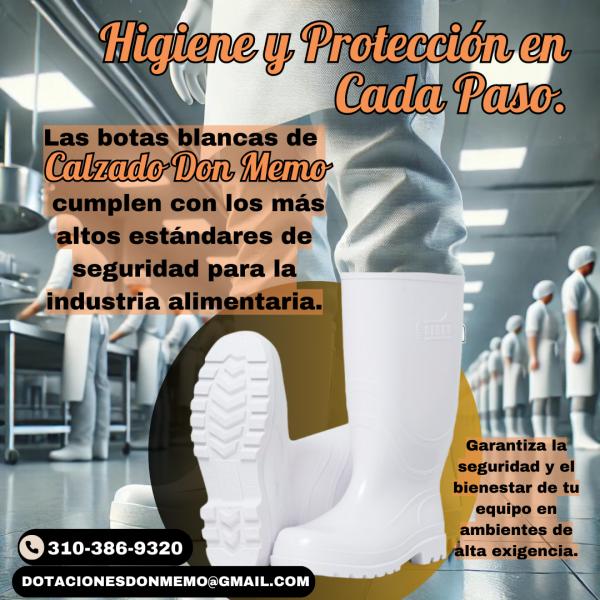 Higiene y Protección en Cada Paso 👷♀️ En Calzado Don Memo, entendemos la importancia de mantener los más altos estándares de seguridad en la industria alimentaria. Por eso, nuestras botas blancas están diseñadas para garantizar no solo la máxima protección, sino también la comodidad en ambientes de alta exigencia. ✔️ Resistencia y durabilidad en cada movimiento ✔️ Cumple con normativas de seguridad alimentaria ✔️ Ideal para entornos donde la higiene es primordial