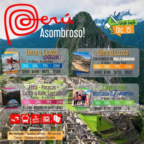 ✨ ¡Prepárate para descubrir Perú como nunca antes! 🌄 📆 ¡Reserva hasta el 15 de diciembre! 🗺️ Opciones de itinerario: Lima y Cusco - 6 días / 5 noches desde $698 Lima y Cusco con pernocte en Valle Sagrado - 6 días / 5noches desde $748 Lima - Paracas - Cusco y Valle Sagrado - 7 días / 6 noches desde $1,035 Cusco con Montaña de los 7 Colores - 4 días / 3 noches desde $541 No incluye tiquetes aéreos, almuerzos ni cenas. ¡No te pierdas esta oportunidad