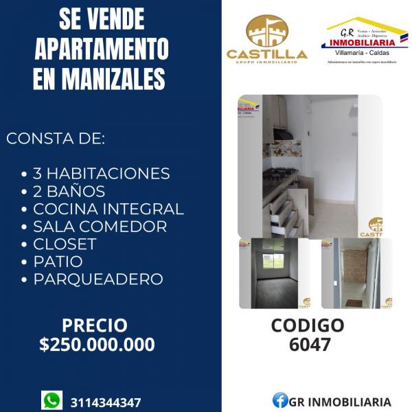 GR Y CASTILLA INMOBILIARIA TIENE PARA LA VENTA APARTAMENTO EN MANIZALES CALDAS A DOS CUADRAS DEL MALL PLAZA Detalles del inmueble: País: Colombia Departamento: Caldas Ciudad: Manizales Zona / barrio: Cerca Al Mall Plaza Precio: $250.000.000 Estado: Usado Tipo de inmueble: Apartamento Tipo de negocio: Venta Características internas Habitaciones: 3 Tipo de cocina: Integral Sala-comedor: si Baños: 2 Closet Área de Lavado: Patio Garaje: Si Administración: Si