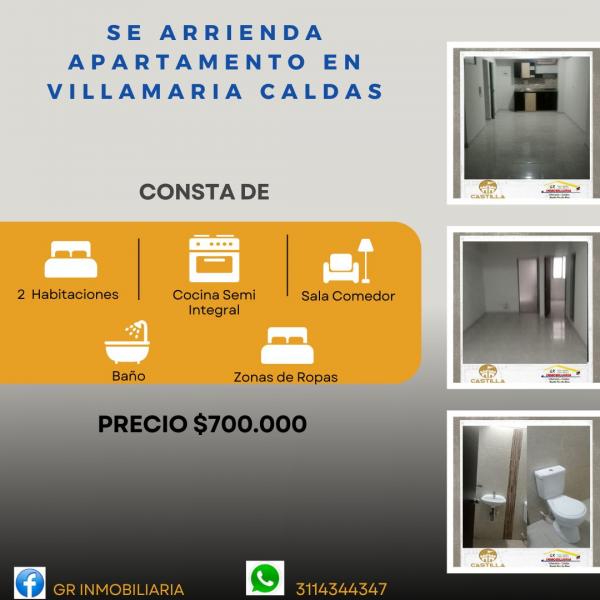 GR Y CASTILLA INMOBILIARIA TIENE PARA ARRIENDO EN VILLAMARIA CALDAS Detalles del inmueble: País: Colombia Departamento: Caldas Ciudad: Villamaría Zona / barrio: Villamaría Precio: $700.000 ¡¡¡ NO INCLUYE SERVICIOS PUBLICOS¡¡ Estado: Usado Tipo de inmueble: Apartamento Tipo de negocio: arriendo Características internas Habitaciones: 2 Tipo de cocina: Semi-integral Área de Lavado: Zona de ropas Baños: 1 Sala-comedor: si