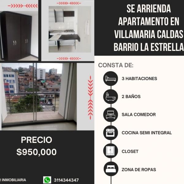 GR Y CASTILLA INMOBILIARIA TIENE PARA ARRIENDO EN VILLAMARIA CALDAS Detalles del inmueble: País: Colombia Departamento: Caldas Ciudad: Villamaría Zona / barrio: La Estrella Precio: $950.000 ¡¡¡ NO INCLUYE SERVICIOS PUBLICOS¡¡ Estado: Usado Apartamento Tipo de negocio: arriendo Características internas Habitaciones: 3 Tipo de cocina: Semi-integral Sala-comedor: si Closet: 2 Baños: 2 Área de Lavado: Zona de Ropas