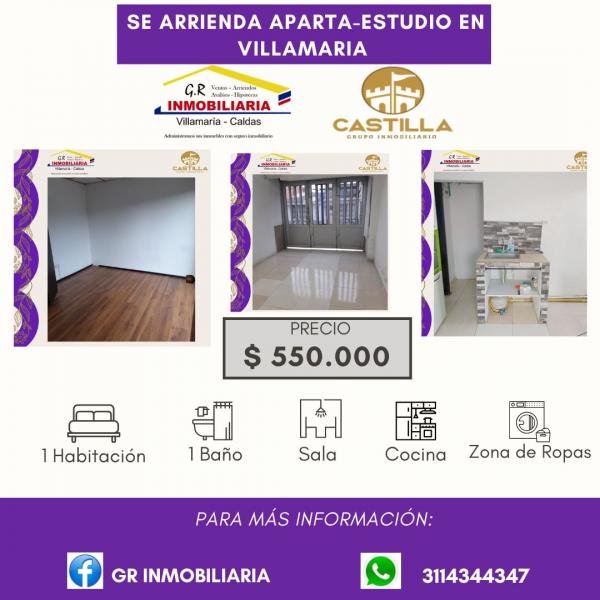 GR Y CASTILLA INMOBILIARIA TIENE PARA ARRIENDO APARTA-ESTUDIO EN VILLAMARIA CALDAS Detalles del inmueble: País: Colombia Departamento: Caldas Ciudad: Villamaría Zona / barrio: Villamaría Precio: $550.000 ¡¡¡ NO INCLUYE SERVICIOS PUBLICOS¡¡ Estado: Usado Tipo de inmueble: Aparta-estudio Tipo de negocio: arriendo Características internas Habitaciones: 1 Tipo de cocina: Cocina sencilla Área de Lavado: Zona de ropas Closet: 1 Baños: 1 Garaje: para una moto Sala: Si