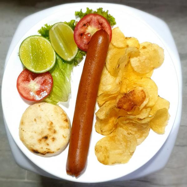 El plato suiza es una salchicha acompañada de papitas, arepa, lechuga, tomate, limón