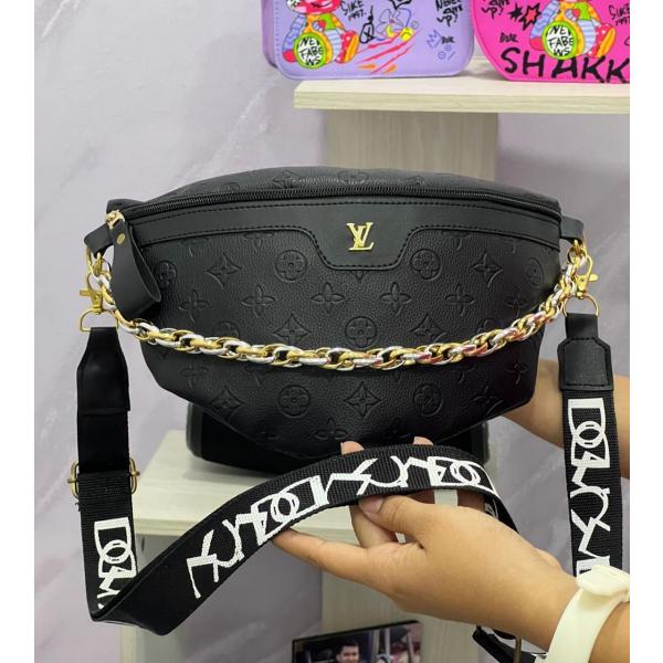 Riñonera marca Louis Vuitton de color negra con detalles dorados con correas ajustables, para lucir de forma casual y elegante.