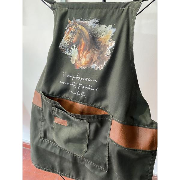 Este delantal es perfecto para amantes del estilo rústico y ecuestre. Confeccionado en una resistente tela de color verde olivo, combina funcionalidad y elegancia con detalles en cuero sintético que le aportan un toque distintivo.