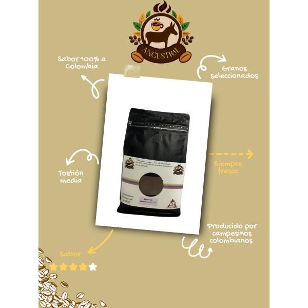 Café de origen tostado y molido 100% colombiano, tueste medio y molienda media con notas a chocolate y nueces.