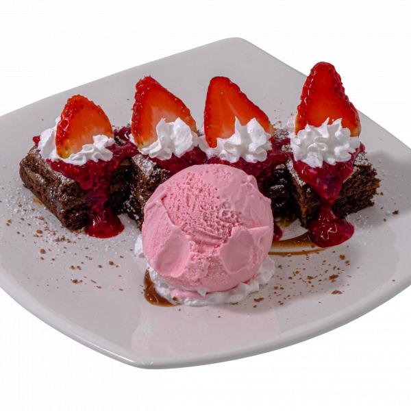 Brownie con una bola de helado, crema chantilli, salsa de frutos rojos, fresas,