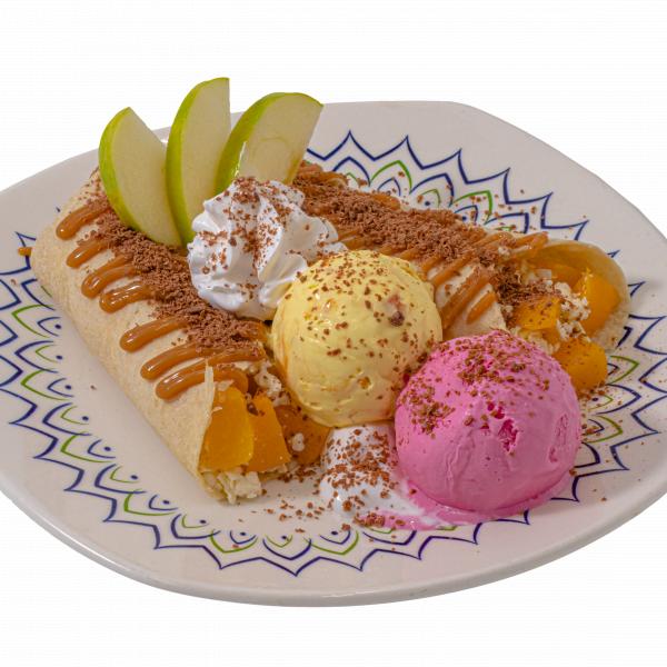 Grap de fruta con queso rayado, crema chantilly , manzana verde, dos bolas de helado a elección y salsa de arequipe
