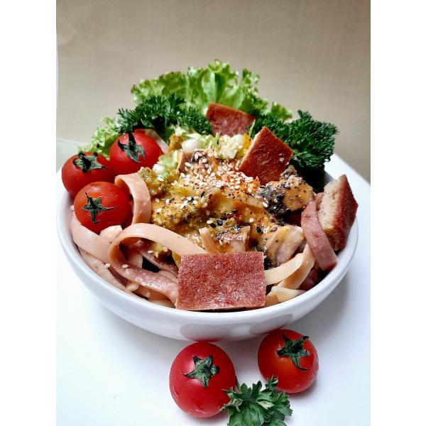 Pasta artesanal de quinoa con hortalizas escalivadas, salsa cremosa de zucchini, queso parmesano o tofu ahumado y con una ensalada.