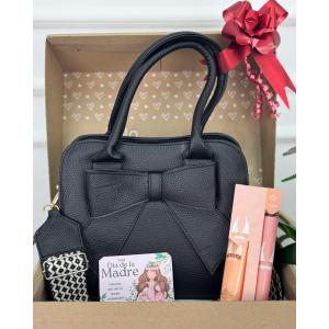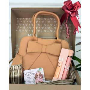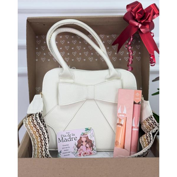 Caja de regalo para el dia de la madre acompañada de cartera, tarjeta a eleccion, decoracion con moño, crema y perfume, color a eleccion del bolso, blanco, beige y negro.