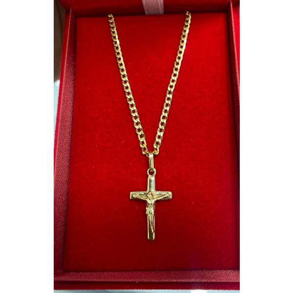 Una joya clásica que refleja fe y elegancia. Esta cadena está elaborada en oro de alta calidad, con eslabones tipo “gourmette” que le dan un aspecto robusto y sofisticado. El dije es un crucifijo con la figura de Cristo, cuidadosamente detallado para transmitir devoción y espiritualidad. Ideal como regalo significativo o como accesorio personal con profundo valor simbólico.