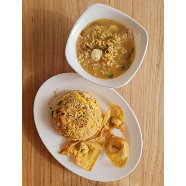 Porcion de arroz chaufa, acompañado de sopa tipo ramen y 2 wantan