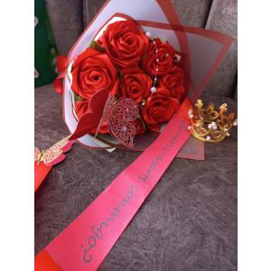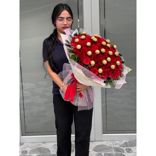 Ramillete elaborado con 100 rosas rojas, fino follaje, papel Coreano y 24 dulces de ferrero.