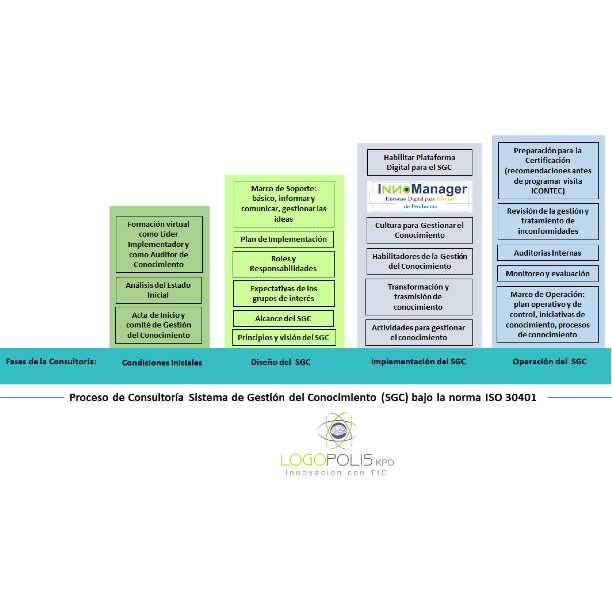 - Realizar el acompañamiento en la aplicación y evaluación inicial del Sistema de Gestión de Conocimiento acorde con el marco ISO 30401 - Ayudar a definir la política de gestión del conocimiento, los alcances del sistema, identificar procesos y actividades, gestión de la colaboración, habilitadores y cultura para gestionar el conocimiento, gestión de la propiedad intelectual y operación del SGC. - Formación y certificación virtual de “Líder Implementador ISO 30401” y de auditor conocimiento