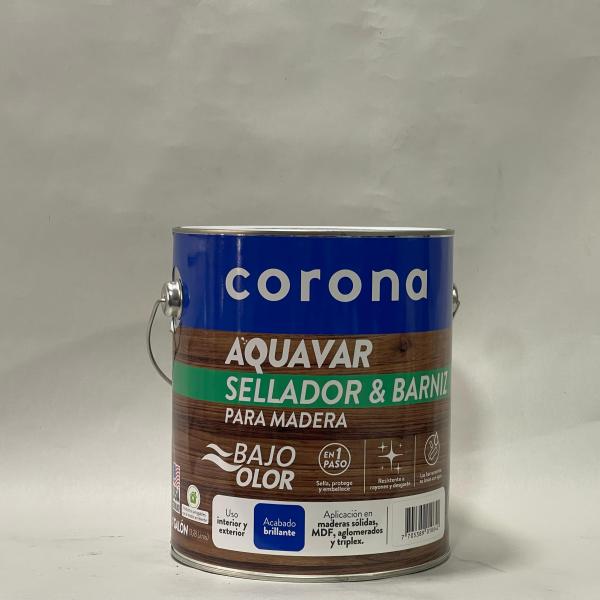 AQUAVAR de Corona es sellador y barniz en uno, ideal para proteger y embellecer maderas interiores. Su fórmula base agua realza la veta natural, seca rápido, no huele fuerte y es fácil de aplicar. Brinda un acabado transparente, resistente y duradero. ¡Protección y belleza en una sola aplicaci