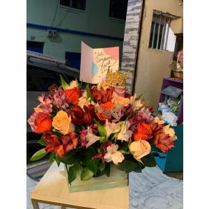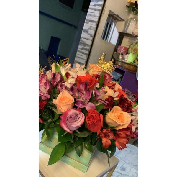 Este espectacular arreglo floral combina rosas en tonos pastel, lirios y astromelias frescas, creando una explosión de color y elegancia. Perfecto para regalar en cumpleaños, aniversarios o fechas especiales. La delicada corona dorada que lo acompaña resalta su aire majestuoso, ideal para hacer sentir reina a quien lo recibe. 🌹 Un detalle único, lleno de vida, belleza y distinción.