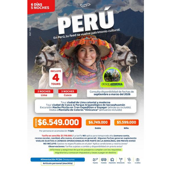Descubre la magia de Perú en un viaje de 6 días y 5 noches que combina historia, tradición y paisajes de ensueño. Vive la modernidad y encanto colonial de Lima, sumérgete en la riqueza cultural de Cusco y explora joyas únicas como el Parque Arqueológico de Sacsayhuamán, la imponente ciudadela de Machu Picchu en tren y la sorprendente Montaña de Colores “Vinicunca”. Con tiquetes, alojamiento, desayunos, tours y traslados incluidos, cada día será una experiencia digna de compartir y recordar.
