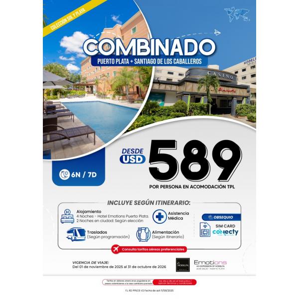 Disfruta de 7 días y 6 noches combinando lo mejor del Caribe entre playas paradisíacas y ciudad vibrante. Con 4 noches en el Hotel Emotions en Puerto Plata y 2 noches en Santiago de los Caballeros, tendrás sol, cultura, gastronomía y diversión en un solo viaje. Incluye traslados, alimentación, asistencia médica y SIM card. El precio depende de las necesidades del cliente.