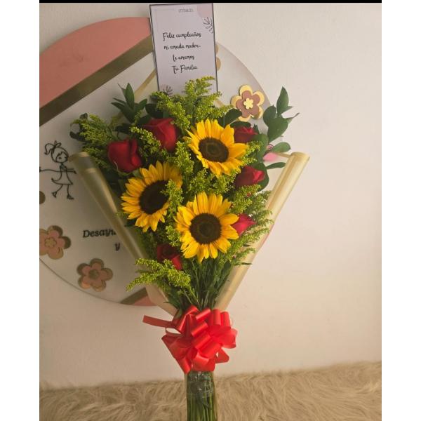 Un detalle lleno de color, energía y elegancia para sorprender en cualquier ocasión. La dulzura de las rosas se une a la alegría de los girasoles en un hermoso ramo de mano que transmite amor, gratitud y felicidad. El precio varía según las necesidades y gustos del cliente, adaptándose para crear un arreglo único y especial. 💛❤️