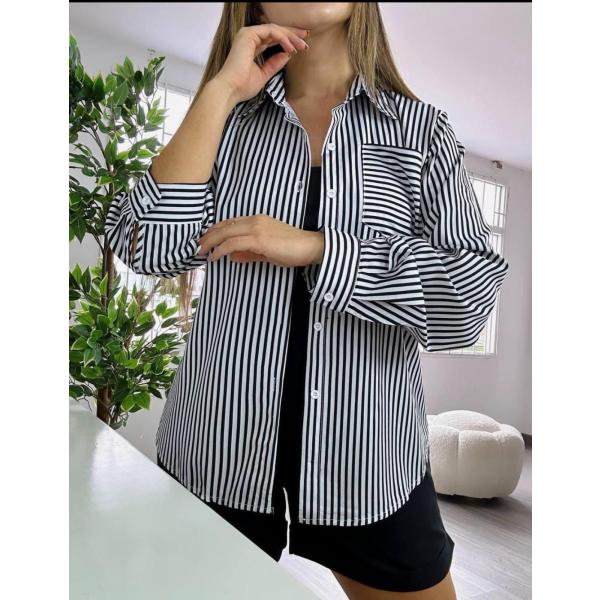 Un clásico atemporal que no puede faltar en tu clóset. Esta camisa de rayas verticales en blanco y negro es ideal para un look profesional o informal. Su diseño de manga larga y su corte suelto ofrecen comodidad y un estilo relajado. El bolsillo en el pecho agrega un detalle funcional. Llévala abotonada o abierta sobre un top para crear un estilo más dinámico. Esta camisa es una prenda versátil que se adapta a cualquier ocasión. Talla M.