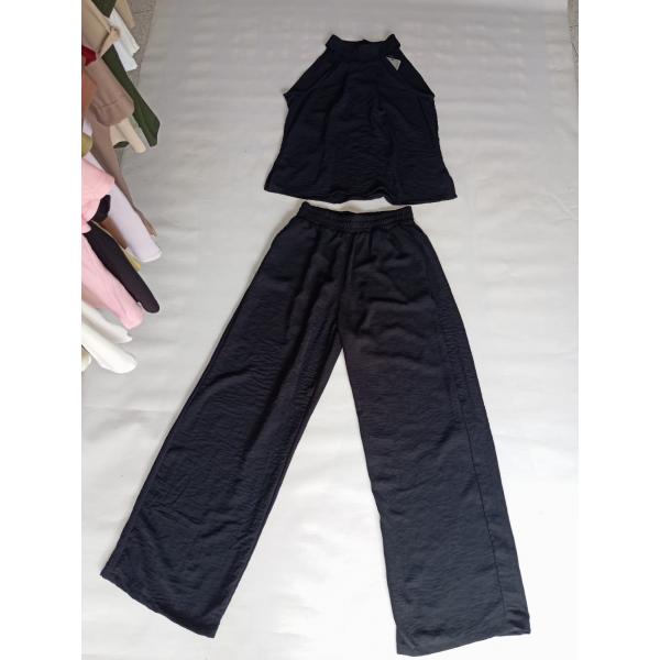 Impresiona con la elegancia minimalista de este conjunto negro. El top con cuello halter resalta tus hombros mientras el pantalón de pierna ancha brinda un movimiento fluido y sofisticado. Es la elección perfecta para un evento formal o una noche de fiesta.