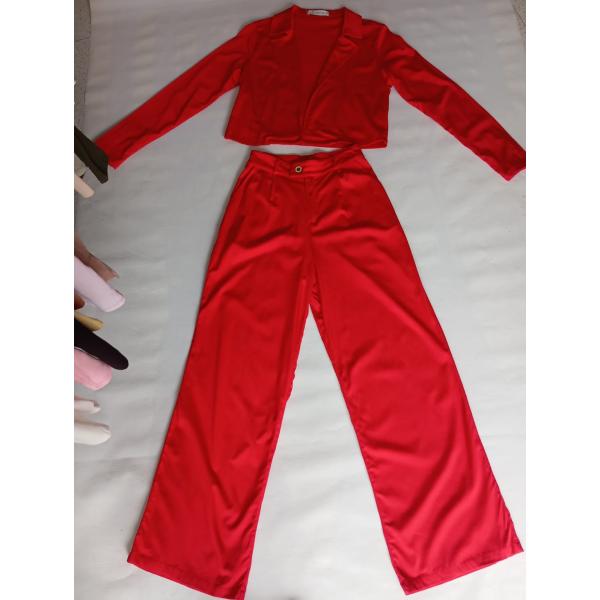 Atrévete a destacar con este vibrante conjunto de blazer y pantalón en color rojo. El blazer corto y el pantalón de corte recto con un solo botón en la cintura ofrecen un look moderno y lleno de personalidad. Es la elección perfecta para una noche inolvidable, una cena de gala o cualquier evento donde quieras ser el centro de atención.