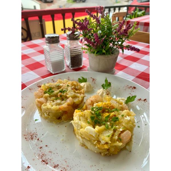 Huevos rotos a la madrileña con camarones