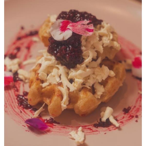 Waffle pandebono acompañado de reducción de mora y queso fresco.
