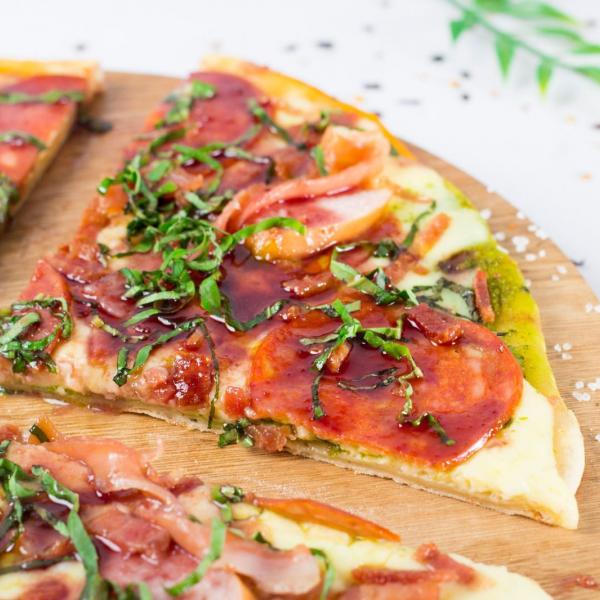 Magnífica pizza 🍕 que captura la esencia pura de Italia. Su base de tres salsas (pesto, bechamel y pomodoro) abraza una selección premium de carnes: jamón serrano curado, salchicha de pavo, tocineta y pepperoni. El toque final es una confitura de albahaca que la hace verdaderamente única. El precio depende del tamaño: Familiar: $71.000 Mediana: $38.000