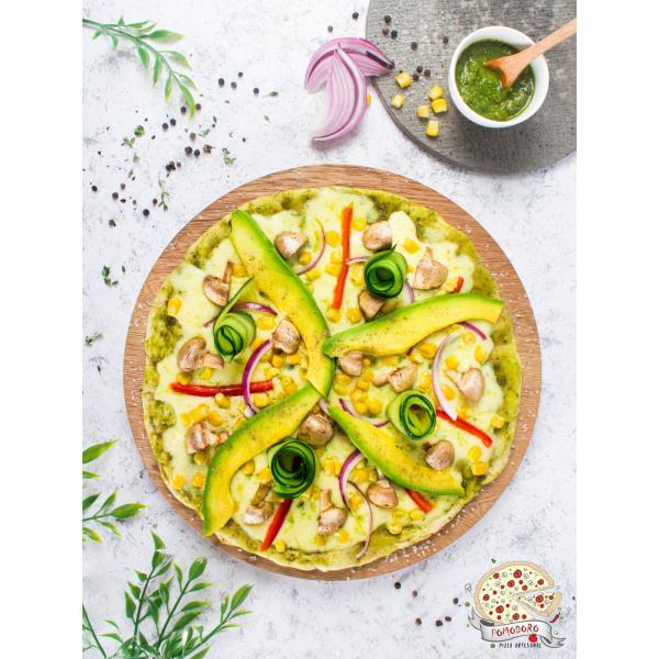 Increíble pizza 🥑 tan deliciosa que no extrañarás la carne. Base de Salsa Pesto fresca, cargada con una colorida y nutritiva mezcla: láminas de aguacate y zuccini, botones de pimentón, maíz dulce y champiñones. ¡Sabor natural y explosivo! El precio depende del tamaño: Familiar: $56.000 Medianan: $31.000