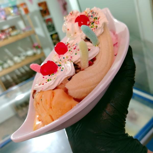 Banana splitheladoscopas de heladoconospaletaspostresdulcehelado cremoso