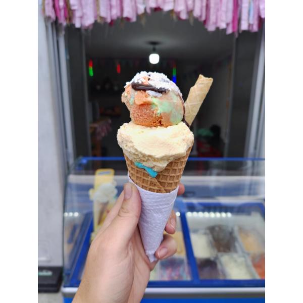 El placer simple de un buen helado en cono. Elige tus sabores favoritos de nuestro cremoso helado y disfruta de la combinación perfecta con un toque de salsa y un barquillo crujiente. ¡Tu momento dulce del día! El precio varía según el número de bolas y los toppings adicionales.