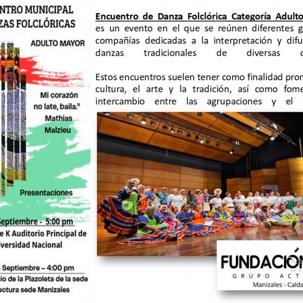 Encuentro de Danza Folclórica Categoría Adulto Mayor es un evento en el que se reúnen diferentes grupos y compañías dedicadas a la interpretación y difusión de danzas tradicionales de diversas culturas
