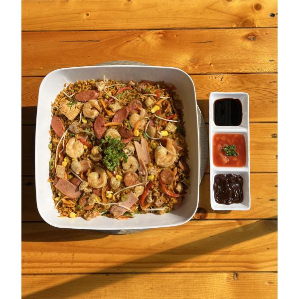 Arroz ideal para tres personas. Pollo, cerdo, chorizo, salchicha, jamón, camarón, platanitos, chicharrón, raíces y verduras.