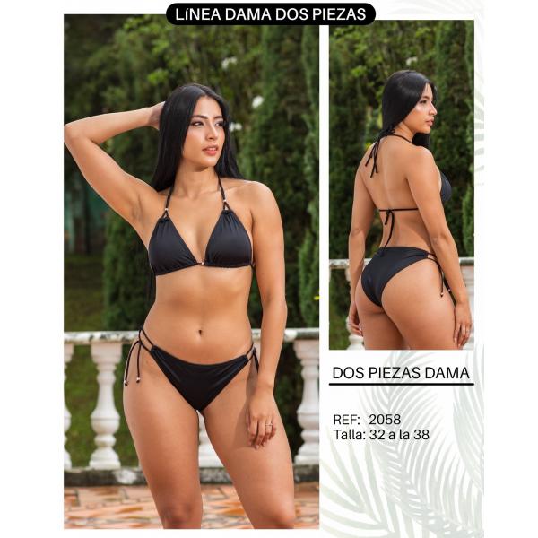 Clásico de dos piezas en negro con detalles dorados. Ajuste perfecto. Sofisticación en el mar o la piscina. REF: 2058. Tallas: 32 a la 38.